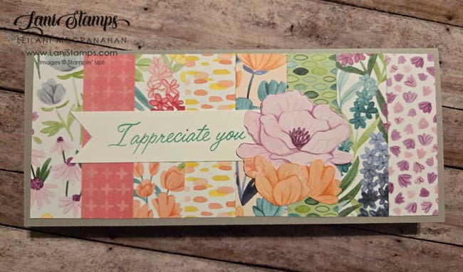 This page introduces the new Florals in Bloom Suite Collection. Didn’t think I needed it until now (so it is now on my wish list.) It uses 1″ strips of the Designer Series Paper and since I didn’t have any of the dies I fussy cut three of the flowers from one of the sheets. The sentiment is from the Online Exclusive Floral Impressions which I received when I attended Back Stage in North Carolina in March. The card base is Smokey Slate.