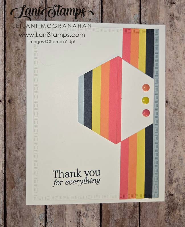 These colors are actually growing on me. I wasn’t a fan at first of most of them, but the more you use them they tend to grow on you. I kept the card simple as it was hard to use them all on one card. I know everything Stampin’ Up! does coordinates, but sometimes they don’t go together in my eye! The strips I used were 1/4″ strips of the 5 different colors. They were glued down to a piece of 5 1/4″ x 4″ basic white cardstock. Then I used a die to outline the edge and then adhered it to the basic white cardstock base.