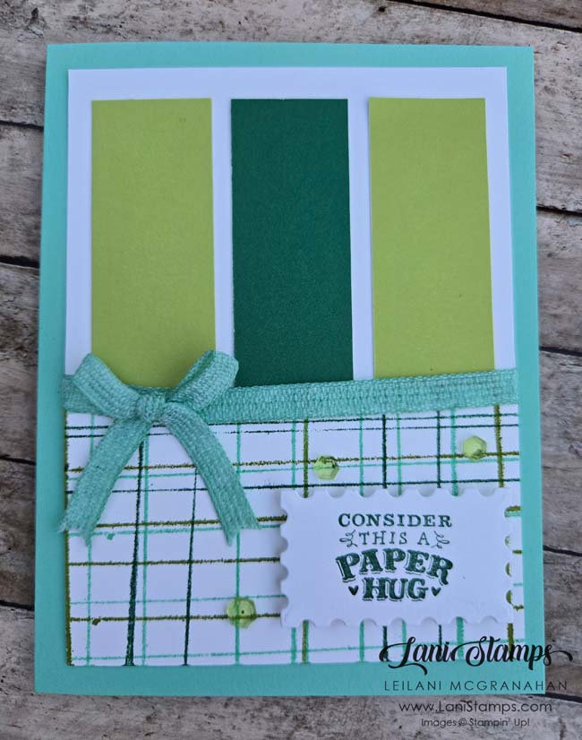 For the plaid I used a technique one of my sister demonstrators taught us the other night at our team meeting. It uses the edge of a Stampin’ Up block and an ink pad. I used a longer Stamp block so the lines went all the way across the paper. Three different colors of ink kept with the color scheme of the card to coordinate the man-made plaid. I think it came out great.